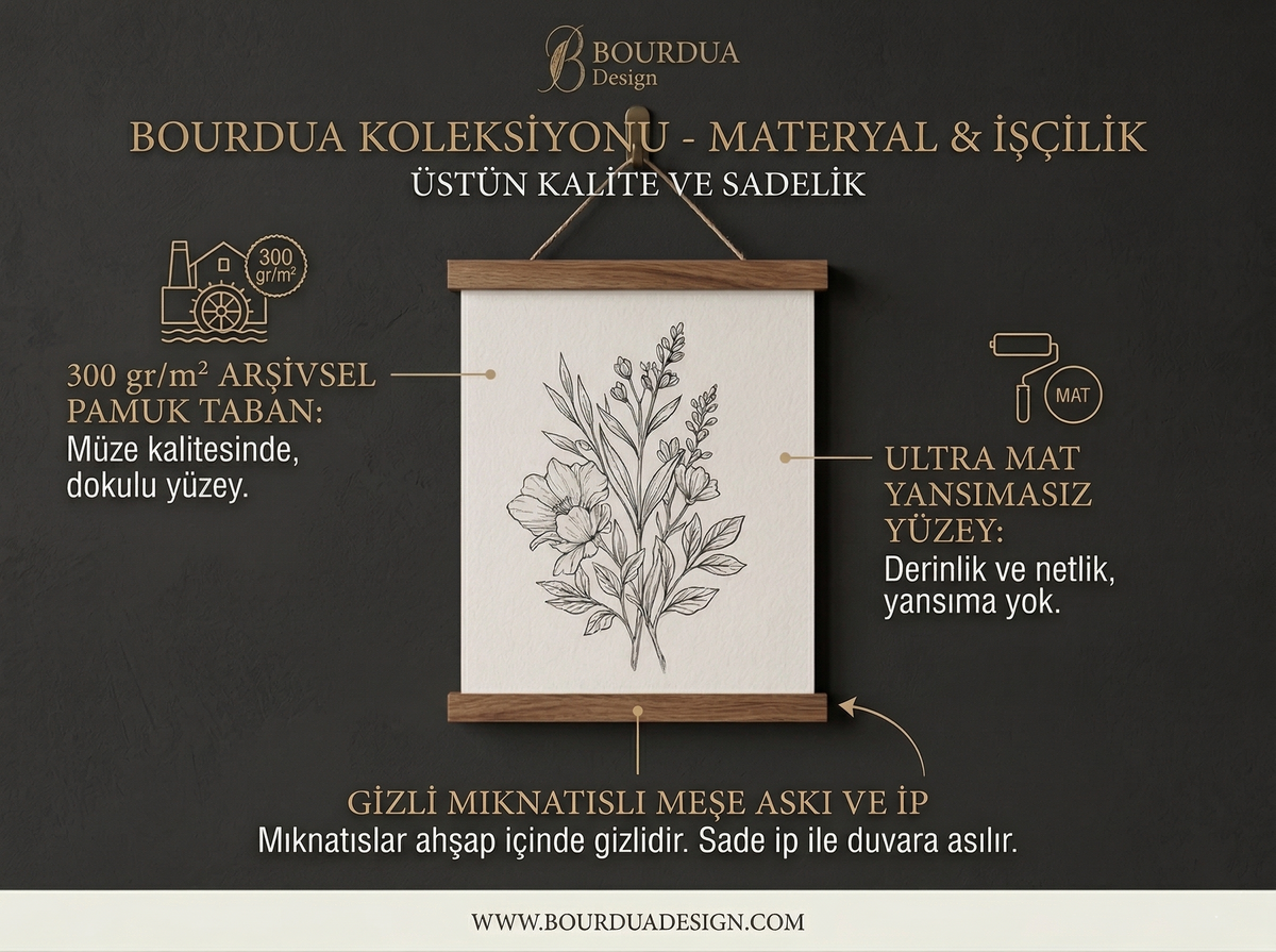Bourdua Design olarak, geleneksel işçiliği modern tasarım disipliniyle buluşturuyoruz. Koleksiyonumuzun ruhunu oluşturan 300 gr/m² arşivsel pamuk tabanlı tuval kağıdı, müze kalitesinde bir derinlik sunarken; ultra mat yansımasız yüzeyi sayesinde her ışık açısında netliğini korur.